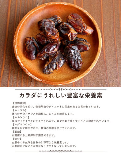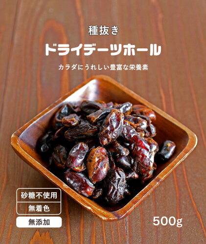 【商品名】種抜き ドライ デーツ ホール 【セヤ種】【名称】デーツ(ナツメヤシの実)【原材料名】デーツ【内容量】500g【保存方法】直射日光、高温・多湿を避けて、常温で保存。